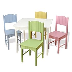 Product DescriptionGreat for board games, tea parties, and arts and crafts, the Nantucket Table and Four Chair Set includes one square white table, and four chairs in pastel colors of lavender, sage, buttercup and sky blue. Measures 23.75" x 19.5" x 23.75".