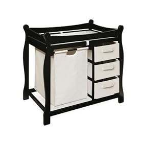 Badger Basket Sleigh Style Changing Table with Hamper/3 BasketsThis Sleigh Style Changing Table keeps everything tidy and concealed for a clean look in the nursery. This changer features a large pull out hamper for dirty clothes or storing bulk packs of diapers and blankets. The three pull-out baskets are ideal for changing supplies, clothes, shoes, shoes, and toiletries. The changing table has four rails along the top for safety and a metal support bar underneath which provides added stability. When baby outgrows this table, it becomes a useful and attractive piece of furniture for clothes and toys.