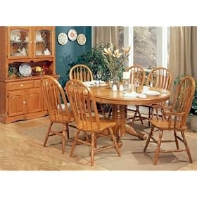 7pc Sunburst Design Solid Oak Veneer Top Dining Table & Chairs SetThis is a brand new 7 pieces dining table with chairs set. The set is designed with a sunburst style with solid oak veneer top nostalgia table with a 24"leaf, scalloped apron and claw foot base. The matching dining chiars are made of solid oak philadelphia 41"H arrow back windsor. Make this item yours today to beautify the decor of your home. Item may require simple assembly.Specifications- Dimensions: Table: 48"L -72"L x 48"W x 30"H, Chair: 17-3/4"L x 20-3/4"W x 41"H, Arm Chair: 17-3/4"L x 20-3/4"W x 41"H- Style Type: Casual Dining- Materials: Hardwoods- Color: Oak- Pieces: 7- Finish: Oak