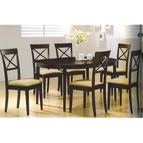 NEW OVAL TABLE WITH 4 CHAIRS IN A RICH CAPPUCCINO FINISH. ADDITIONAL TWO CHAIRS AVAILABLE CAN BE ADDED TO LISTING PLEASE INQUIRE ALSO DELIVERY ONLY TO THE FOLLOWING AREAS EAST COAST FLA TO MASS AND MOST CENTRAL AREAS USA AND AREAS IN BETWEEN PLEASE INQUIRE IF YOUR NOT SURE IF YOUR IN OUR DELIVERY AREAS ALLOW 14 TO 21 DAYS SOMETIMES SOONER DEPENDING ON OUR COMPANY TRUCKS ROUTES AT THE TIME OF PURCHASE THANKS TABLE HAS A LEAF IT EXTENDS TO 60" THE TABLE IS MADE OF SOLID HARDWOODS AND WOOD VENEER TOP THE CHAIRS ARE MADE OF A STRONG DURABLE MICRO FIBER FABRIC. TABLE IS: 42" WX 42"-60" LX 30"H CHAIRS ARE 17-3/4" WX 21-3/4"DX 39"H
