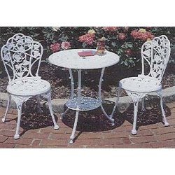 Enjoy a stunning Victorian-style focal point in your garden.This timeless leaf and vine design in lightweight, easy-care cast aluminum takes its inspiration from heavier cast iron predecessors.It's durable and maintenance free with stainless steel hardware and white powder coating. Assembly required. Chairs are 15" dia x 31" high and the tableis24" dia x 26" high. .
