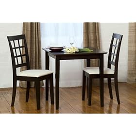 A beautiful three piece kitchen set featuring a 30" x 30" inch solid wood table and two dinette chairs. This casual dining set is solid wood in a unique Wengi color finish. Wengi is the color of Espresso. This is a warm and stylish color for a solid wood dining set. The lattice back design allows you to match almost any decor. The fabric cushion is a creamy white which helps accentuate the espresso color of the wood. The dining set ships via Fedex Ground in 2 boxes (two chairs in one box and one table). Instructions and hardware included. The whole back of the chair is already assembled - you simply need to attach the back of the chair to the front section and the seat. In stock now