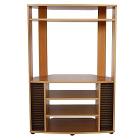 4D Concepts Corner Entertainment Center gives you space - saving style and organization! Fits like a glove in the corner of the room to accommodate your 27" TV... and so much more! Set your DVD or cable box in the open shelf above your TV, while "parking" your other media needs on the 3 open shelves below. 2 of the shelves even adjust so you can customize the space to meet your needs better. Side racks on both sides of those shelves offer up visible storage for your CD's. Measures 33 1/4 w. x 19 d. x 49 1/2" h. Beech or cherry finish. State Color. Get yours now! 4D Concepts Corner Entertainment Center