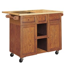 This Kitchen Butler« is designed to give you the space to prepare, and the storage essential for gourmet food preparation. Wood top includes an inset black granite cutting board that is ideal for cutting or pastry prep, and is easily removed for cleaning to keep your work surface sanitary. Drop leaf portion of wood top can be used as a breakfast bar or for additional prep space. Tons of storage space which includes a removable knife block, a multi bin drawer with lift-out tray, a spice rack, two open shelves, towel holders, hooks for potholders and utensils, and hidden storage for a trash can or for cookware. Some assembly required.