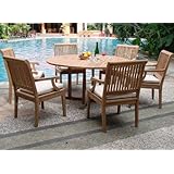 New 7 Pc Luxurious Grade-A Teak Dining Set - 60" Round Table And 6 Arm ChairsProduct Description: Set includes: 60" Round Table and 6Arm Chairs. ** Wood Umbrella Hole Plug is also provided. ** 2" Umbrella Hole is available in the middle of the table. ** Umbrella isnot included with the set, but can be purchase separately, please inquire. ** DON'T FORGET TO ENQUIRE ABOUT OUR SUNBRELLA CUSHIONS (SOLD SEPARATELY) ** If you need more chairs, please let us know. ** Assembly: Very little assembly is required. This furniture will be delivered in partially assembled sections. Assembly is quick and simple. **Accessories shown in picture are not included with the set. Please inquire if you are interested.