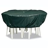 This patio cover is large enough to protect our 45-inch round table and its 5 chairs. The reversable vinyl looks nice on either side.Caveats: we didn't need one with a hole in the middle (for umbrella poles), and in fact we've had to use an extra piece of plastic to cover the hole; a hole-less option would have been useful. Also, although the cover has a draw-string to achieve a snug fit, and keep it from blowing off, the draw-string tends to bind and bunch in one place and has to be spread uniformly with some effort.